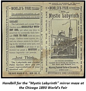The “Mystic Labyrinth” at the 1893 Chicago World’s Fair (World’s Columbian Exposition) was a popular mirror maze attraction located in the Midway Plaisance, offering confusing pathways and illusions for visitors, a precursor to modern funhouses and glass houses, and was part of the fair’s entertainment section alongside the original Ferris Wheel and other exotic displays. Handbills advertised this “Mystic Labyrinth” mirror maze, which was later shipped out from Chicago after the fair closed, highlighting its success as an immersive, perplexing attraction.