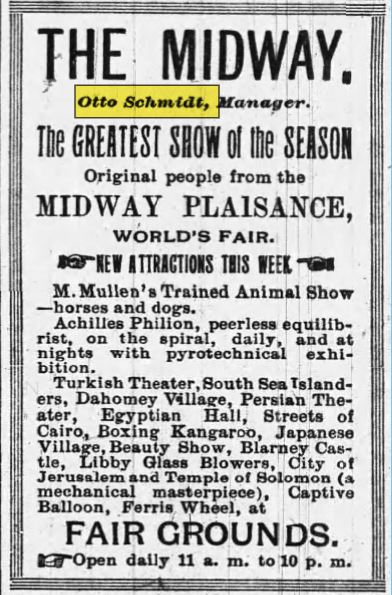 “About July 1893, Joe Bailey’s, owner of the People’s Theater having sold his lease to the theater to Colonel Hopkins, the originator of the 10 cent, 20 cent, 30 cent idea and theater prices, was talked into this by Mr. Otto Schmidt. His idea was to take the important attractions of the Midway at the World’s Fair in Chicago out to the general public all over the United States. And that way they could play fairs that were already active. The fairs, the state fairs, were not as they were now. The state fairs were events where they had Car Races and Grandstand features, so this idea to actually take the attractions to the two state fairs that were at the Midway Plaisance at the Chicago World’s Fair was a very new idea. The winter of 1893 and 1894, Otter Schmidt organized his first company and tried it out in Toledo, OH. He made the jump there to St. Louis, MO, then to New Orleans, LA, where a disastrous season was closed.