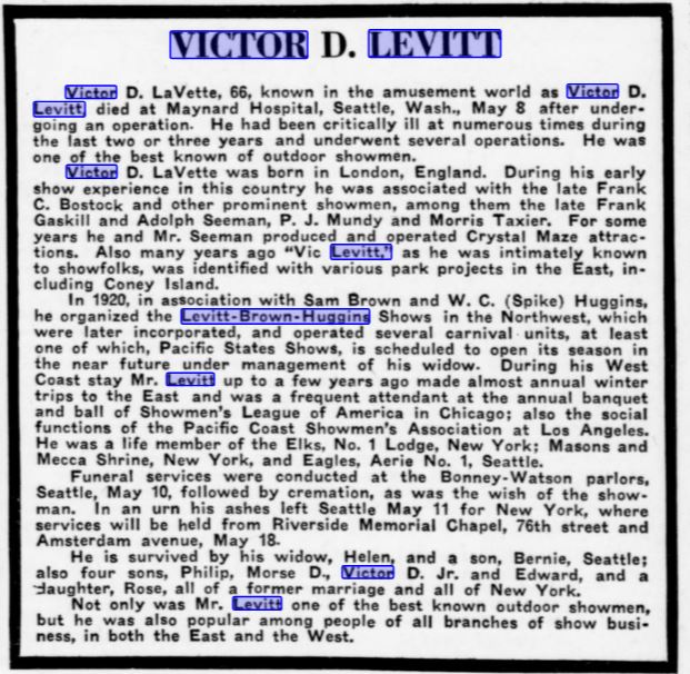 Victor D. Levitt passed away on May 8, 1933, in Seattle after years of illness. His death was widely noted in trade and regional newspapers, which credited him as one of the early organizers of traveling carnival companies in America. His ashes were returned east in accordance with his wishes.
